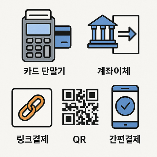 카드 단말기, 계좌이체, 링크결제, QR, 간편결제 등